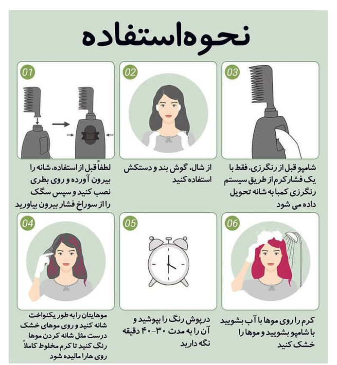 اول خوب تکان میدهیم نکته خیلی مهم ک باید اول خوب تکان بدید بعد اهرم زیر شانه را بیرون می آوریم تا شانه به سمت پایین حرکت کند و شامپو از داخل شانه به بیرون بیاید(در صورت مشکل داخل دایرکت پیام بدید ک کلیپ آموزشی برایتان ارسال شود) شامپو با استفاده از شانه ای ک دارد به مو زده و مطمئن میشویم کل موها با شامپو پوشش داده شده است بعد موها را داخل کلاه پلاستیکی موجود درون محصول میکنیم و بعد از ۴۵دقیقه موها را میشورید و از رنگ موهاتون لذت میبرید. در طول این زمان ۲ الی سه بار موهارو با بادگرم سشوار شوک بدید