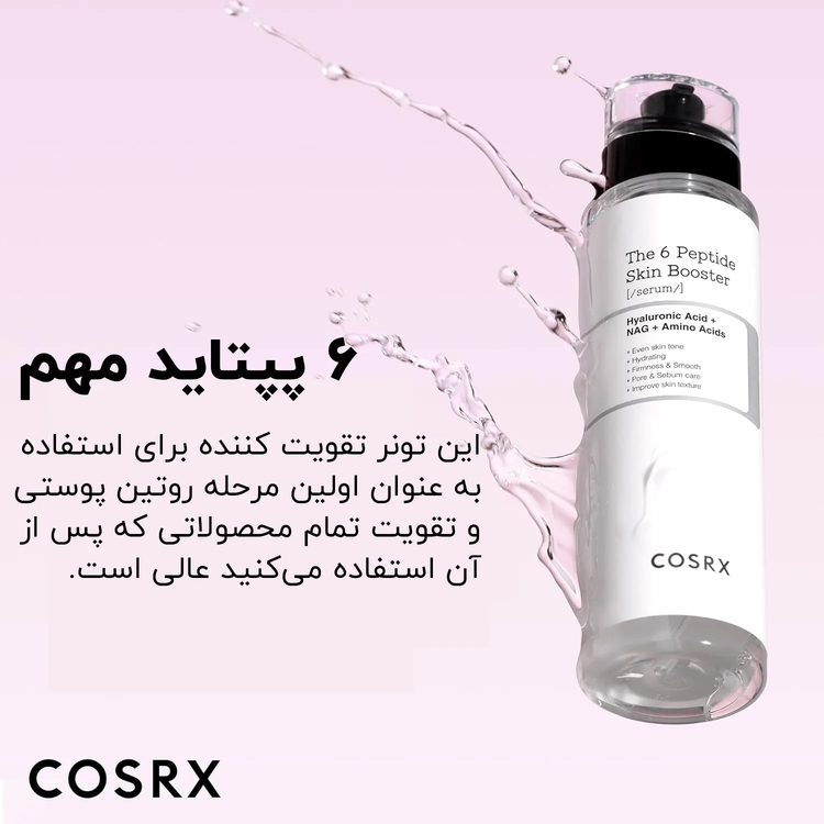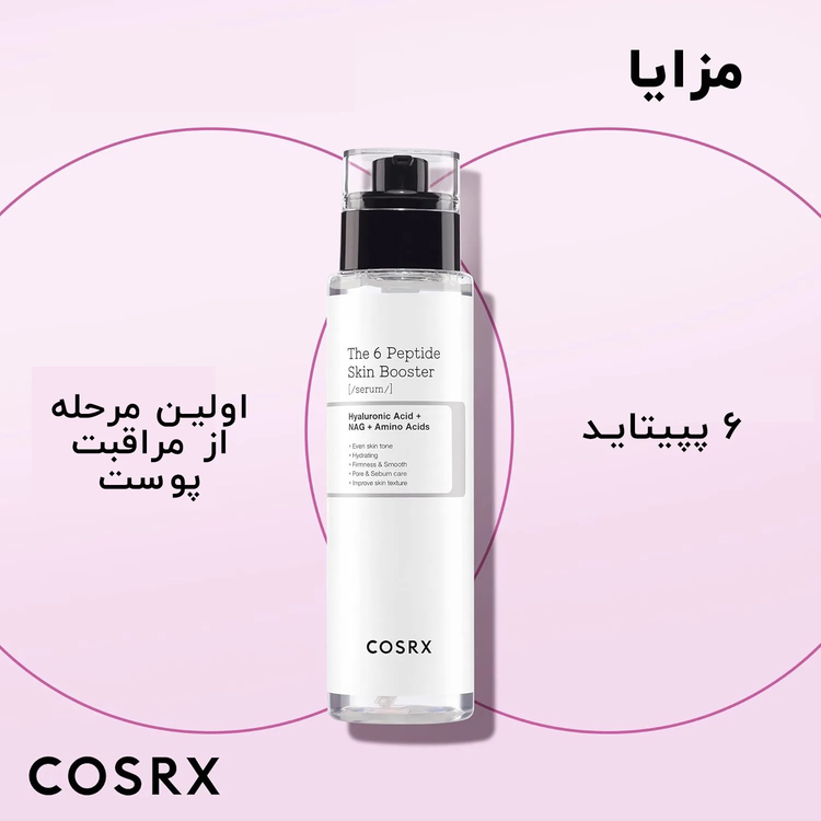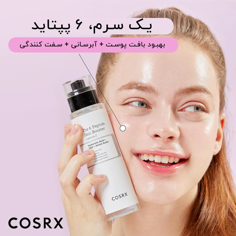 سرم ۶ پپتاید کوزارکس (COSRX The 6 Peptide Skin Booster Serum) محصولی پیشرفته از برند کرهای کوزارکس است که با ترکیبی از شش پپتاید قدرتمند به بهبود کلی وضعیت پوست کمک میکند. این سرم با هدف کاهش چین و چروک، بهبود استحکام و الاستیسیته پوست، تنظیم ترشح سبوم و کوچک کردن منافذ پوستی تولید شده است. بافت سبک و جذب سریع این محصول، آن را به گزینهای مناسب برای انواع پوست، بهخصوص پوستهای مختلط تا چرب تبدیل کرده است. همچینین استفاده منظم از از سرم 6 پپتاید میتواند باعث بهبود بافت و افزایش درخشندگی طبیعی پوست شود.