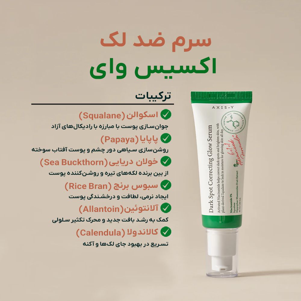- سرم اکسیس وای یک محصول ضد لک با کیفیت کره ای است که غنی از نیاسینامید بوده و به اصلاح لکهای تیره پوست و جای جوشها پرداخته و سطح و رنگ پوست را صاف و یکدست میکند. دارای خاصیت روشن کنندگی است و با حفظ رطوبت پوست درخشش همیشگی را برای آن به ارمغان میآورد. سرم نیاسینامید اکسیس وای التهاب جوشها را بهبود بخشیده و به درمان هر چه سریع تر آنها و جلوگیری از ایجاد جای جوش کمک میکند.